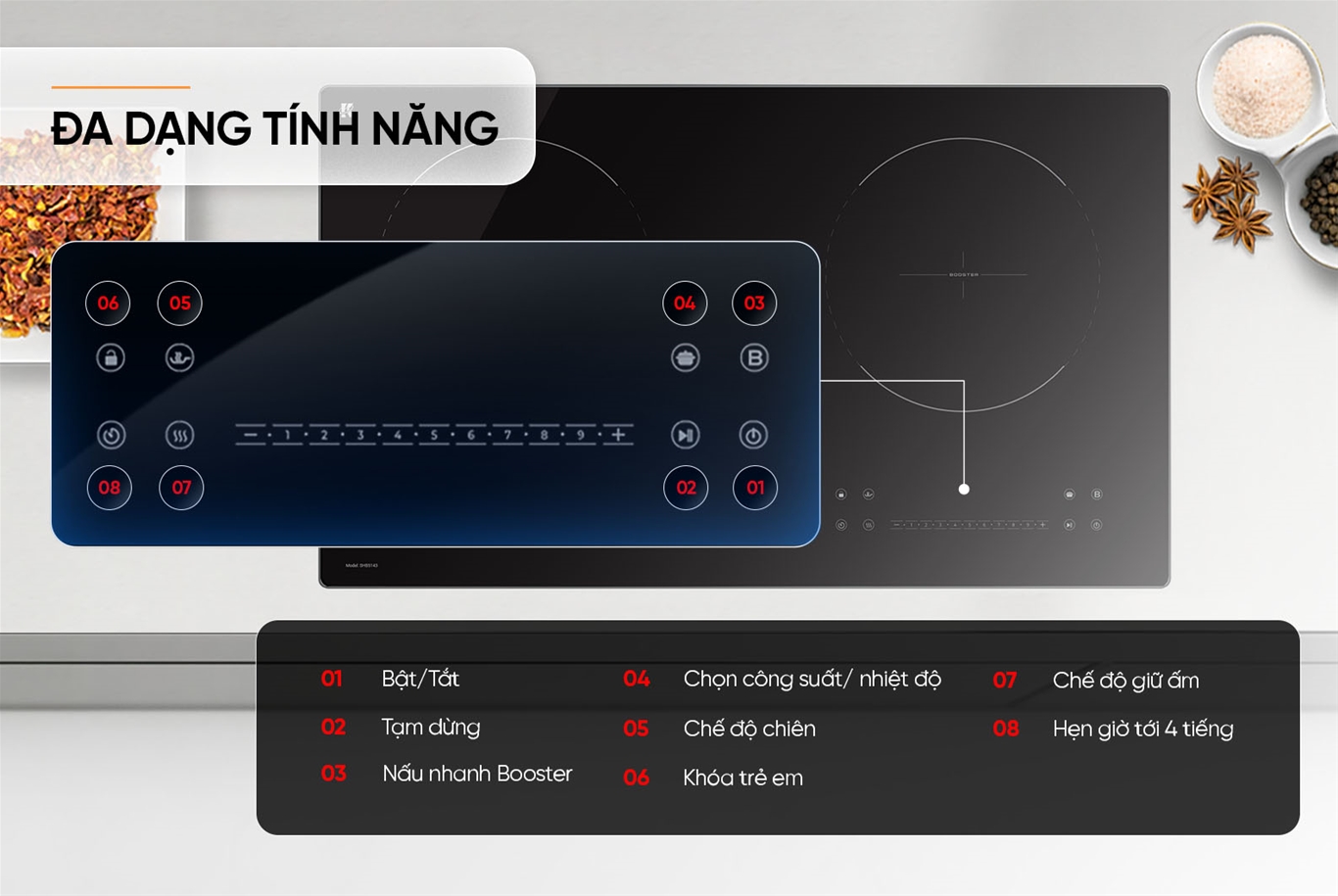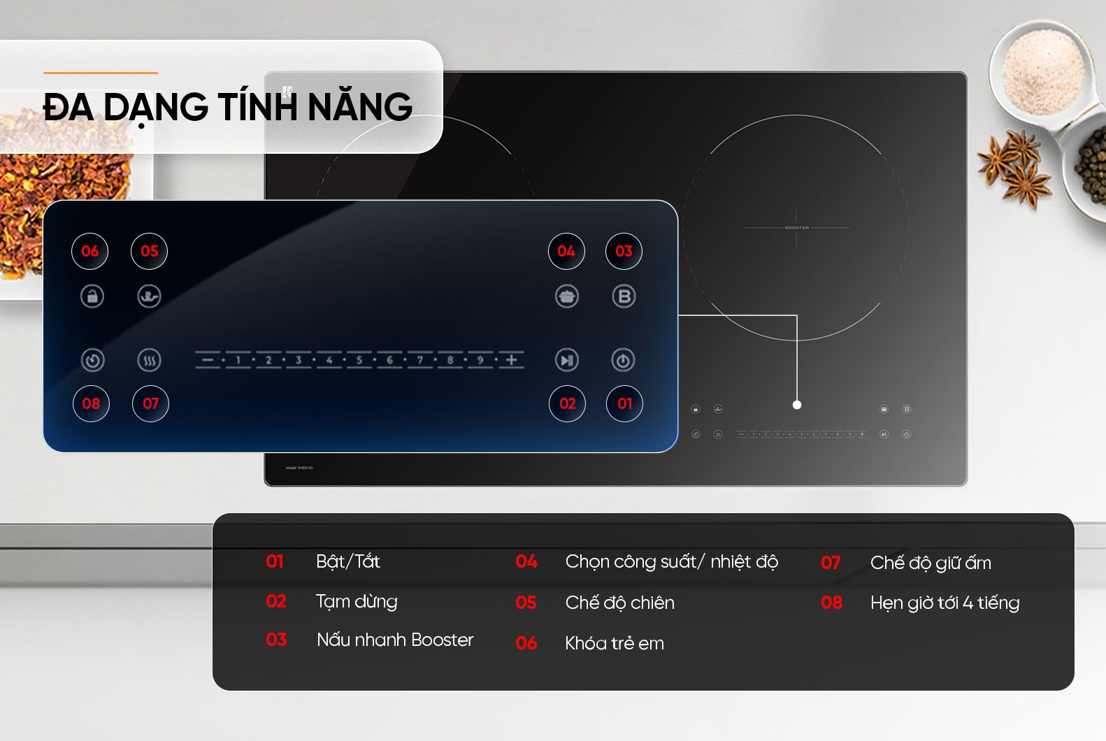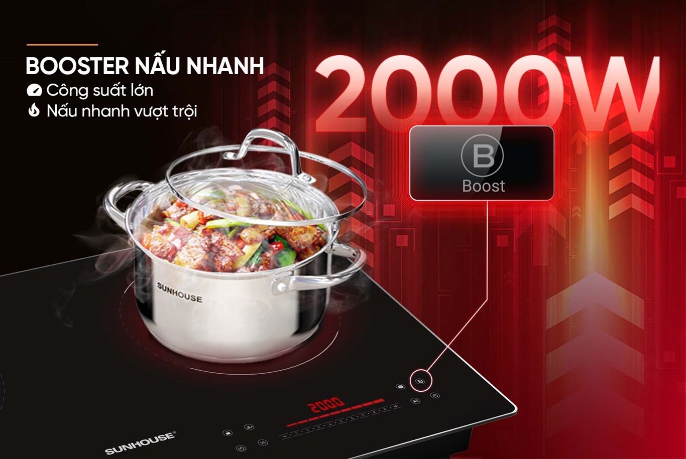Khi kích hoạt chế độ Booster trên bảng điều khiển, công suất của bếp sẽ được đẩy nhanh lên đến 90% so với các loại bếp từ thông thường. Tính năng này không chỉ là “giải pháp cứu cánh” cho bạn trong những trường hợp cần tiết kiệm thời gian đứng bếp mà còn giúp việc chế biến các món ăn như xào, luộc, hấp…không bị dai và giữ trọn được dưỡng chất.