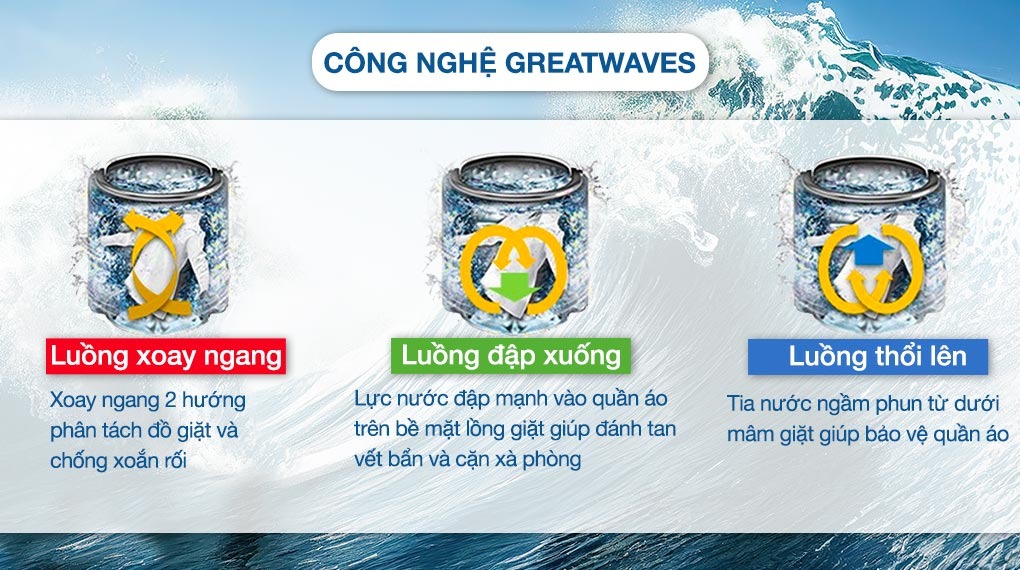 – Công nghệ Greatwaves: với sự kết hợp 3 luồng nước cùng các tia nước tạo ra từ lỗ phun của máy giặt Toshiba, thiết bị kiến tạo luồng nước siêu mạnh giúp phân tách quần áo, chống xoắn rối, loại bỏ vết bẩn, cặn xà phòng, giúp giặt sạch và bảo vệ chất liệu vải.
