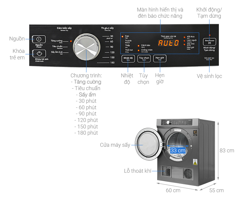 – Mức nhiệt độ sấy: Cao – Trung bình – Thấp – Thổi hơi.