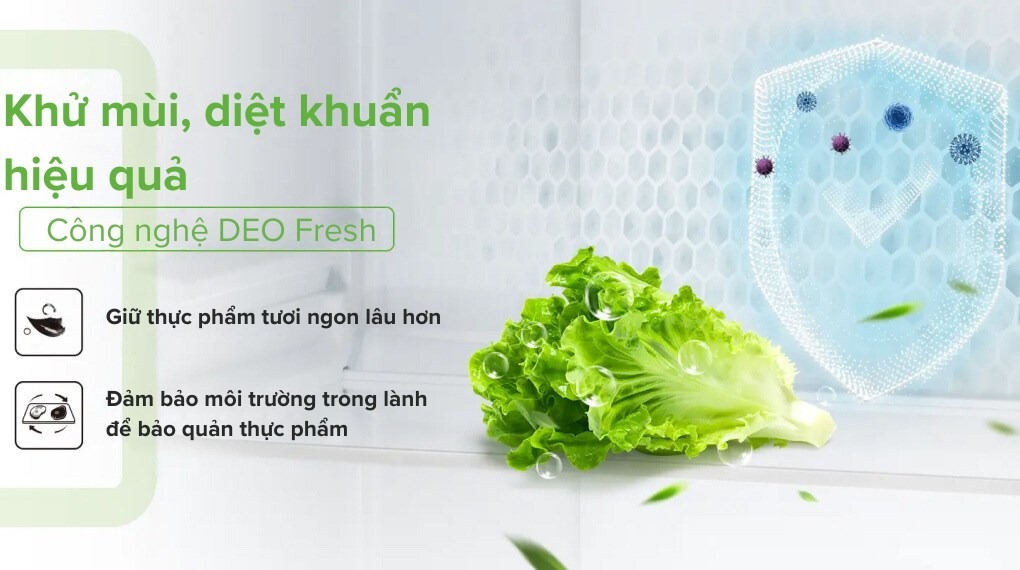 – Công nghệ DEO Fresh sử dụng các ion bạc Ag+ để làm sạch không khí trong tủ lạnh, loại bỏ vi khuẩn và đảm bảo không khí luôn trong lành. Điều này không chỉ giúp thực phẩm giữ được độ tươi ngon, mà còn kéo dài thời gian sử dụng của các loại trái cây, rau củ và các thực phẩm khác. Đây là một giải pháp hiệu quả để bảo quản thực phẩm và đảm bảo chất lượng dinh dưỡng cho gia đình bạn.