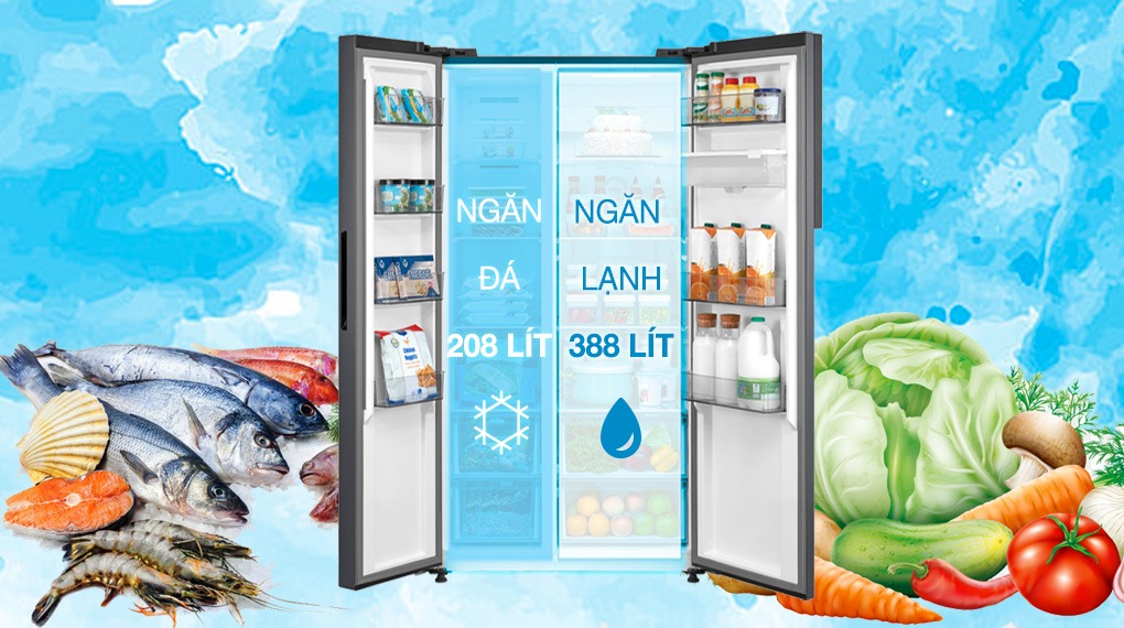 – Ngăn lạnh có dung tích 388 lít, chia làm 4 ngăn và 2 hộc đựng rau củ quả. Phía bên cánh cửa tủ ngăn lạnh được thiết kế 3 khay chứa và 1 hộp đựng nước.
