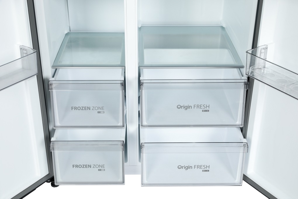 – Thiết kế cửa tủ thông minh: Hỗ trợ người dùng có thể kéo ngăn chứa ra hoàn toàn khi mở cửa tủ 90 độ, thuận tiện cho việc lấy và cho vào thực phẩm bên trong tủ.